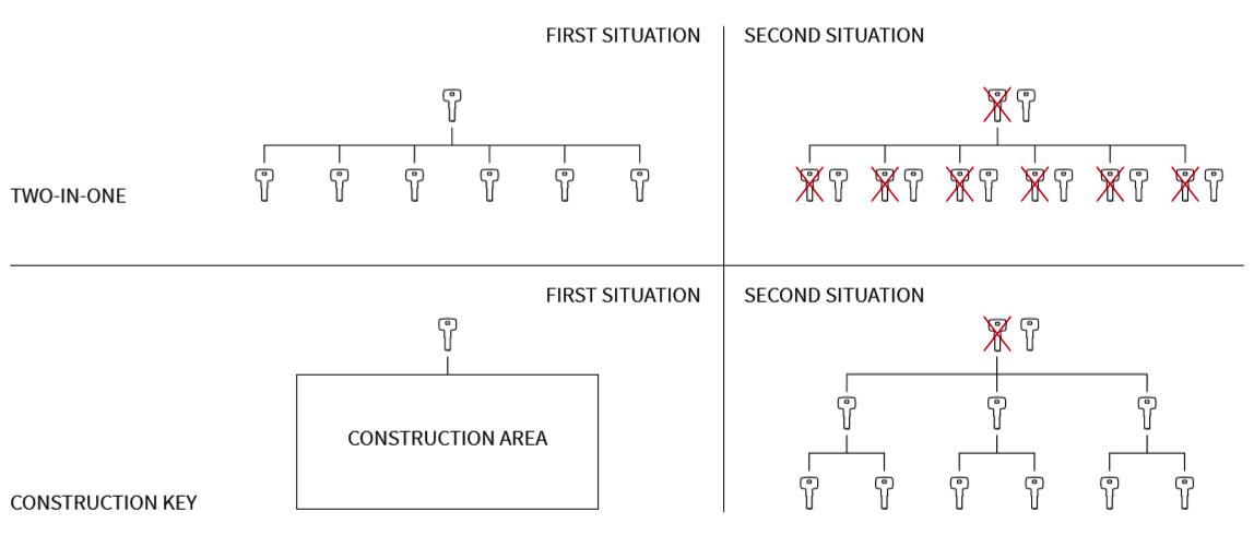 Deze unieke functie stelt je in staat om de cilinders in jouw systeem te veranderen, zonder dat je fysiek een cilinder hoeft te vervangen! Met 2-in-1 heeft elke cilinder een terugvalconfiguratie ingebouwd en wordt geleverd met een tweede set sleutels. Wanneer je vermoedt dat jouw veiligheid in het gedrang is gekomen, hoef je alleen maar een sleutel van de secundaire set te gebruiken en de primaire set is direct onbruikbaar! In een groter sluitsysteem houdt DOM de secundaire set voor je in bewaring, zodat de overgang van de primaire naar de secundaire set soepel verloopt in jouw hele organisatie.